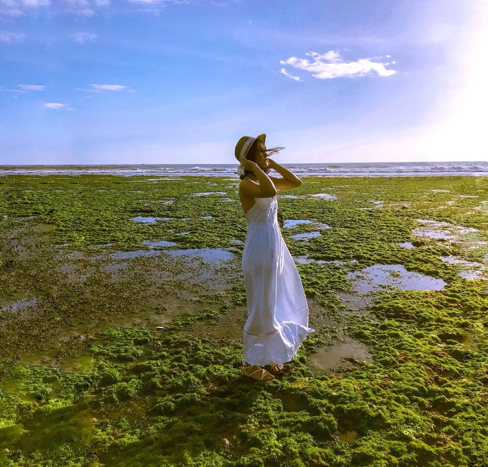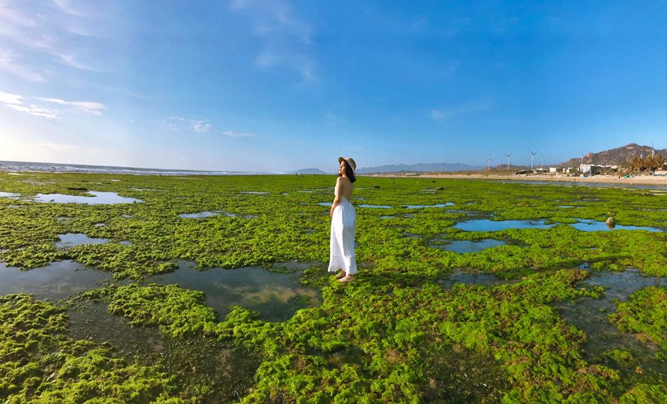 Nằm trên cung đường ven biển Ninh Thuận, cánh đồng rong biển mang trong mình vẻ đẹp quyến rũ say mê lòng người và chỉ xuất hiện đúng hai lần trong ngày. Đó là lúc bình minh và lúc hoàng hôn, đây là thời khắc thủy triều xuống mức thấp nhất.